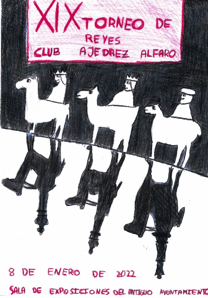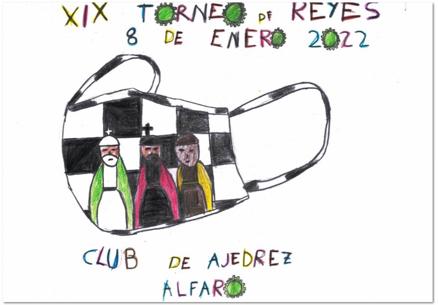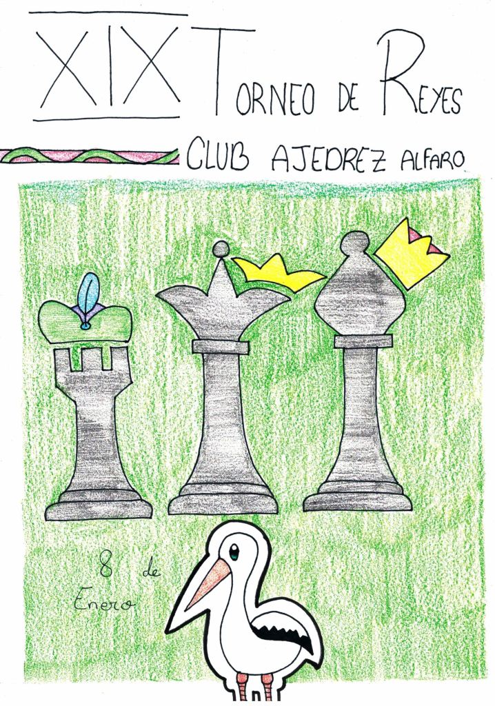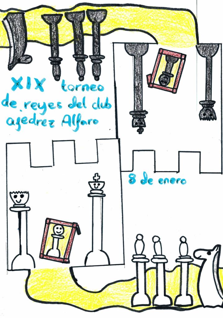 Para la XIX edición de nuestro tradicional Torneo de Reyes del Club Ajedrez Alfaro volvimos repetir la propuesta de someter a concurso el cartel oficial del torneo. Los dibujos recibidos de los niños de la Escuela nos volvieron a poner en grandes dificultades para decidirnos por uno solo. Nuevamente recibimos unos trabajos dignos, cualquiera de ellos, de ser el escogido.