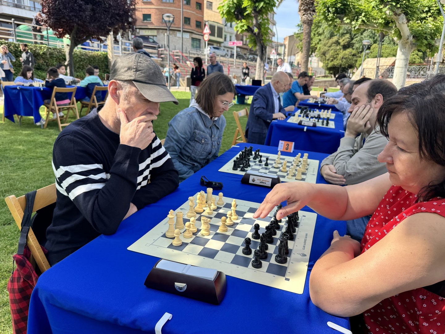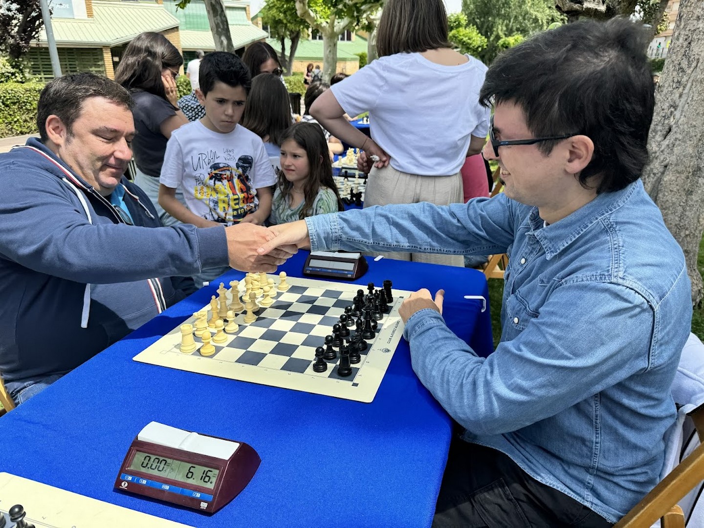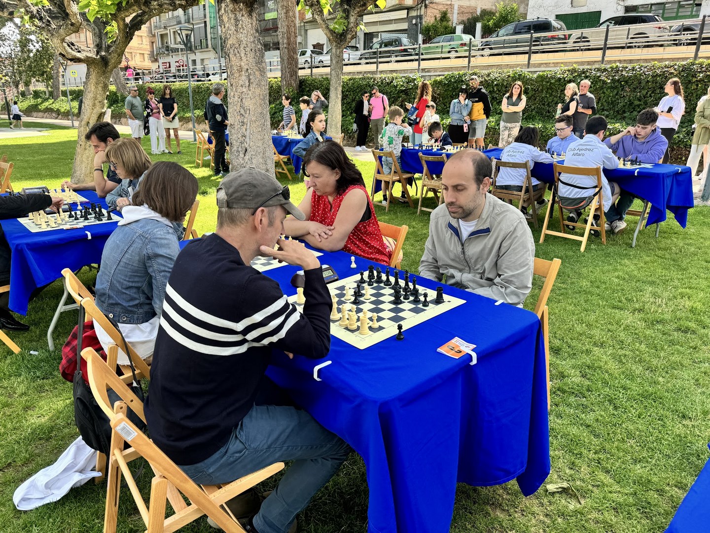 El de los mayores enfrentó por un lado a jugadores de Alfaro, Logroño y Aldeanueva, en el equipo al que denominamos como los Titanes del Ebro. Y por otro lado a jugadores de Arnedo y Calahorra, en el equipo al que bautizamos como los Titanes del Cidacos. Repitieron varios enfrentamientos con blancas y con negras entre sí. El duelo de titanes resultó de lo más ameno, y al final se resolvió a favor de los del Ebro, incluso después de un último reto a todo o nada aceptado por ambos contendientes.