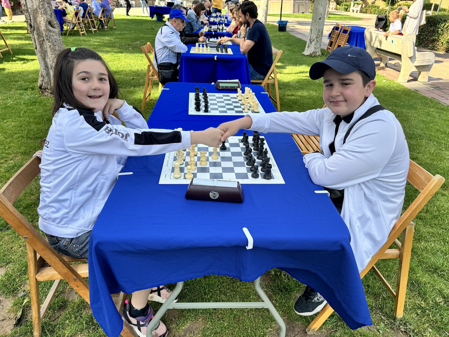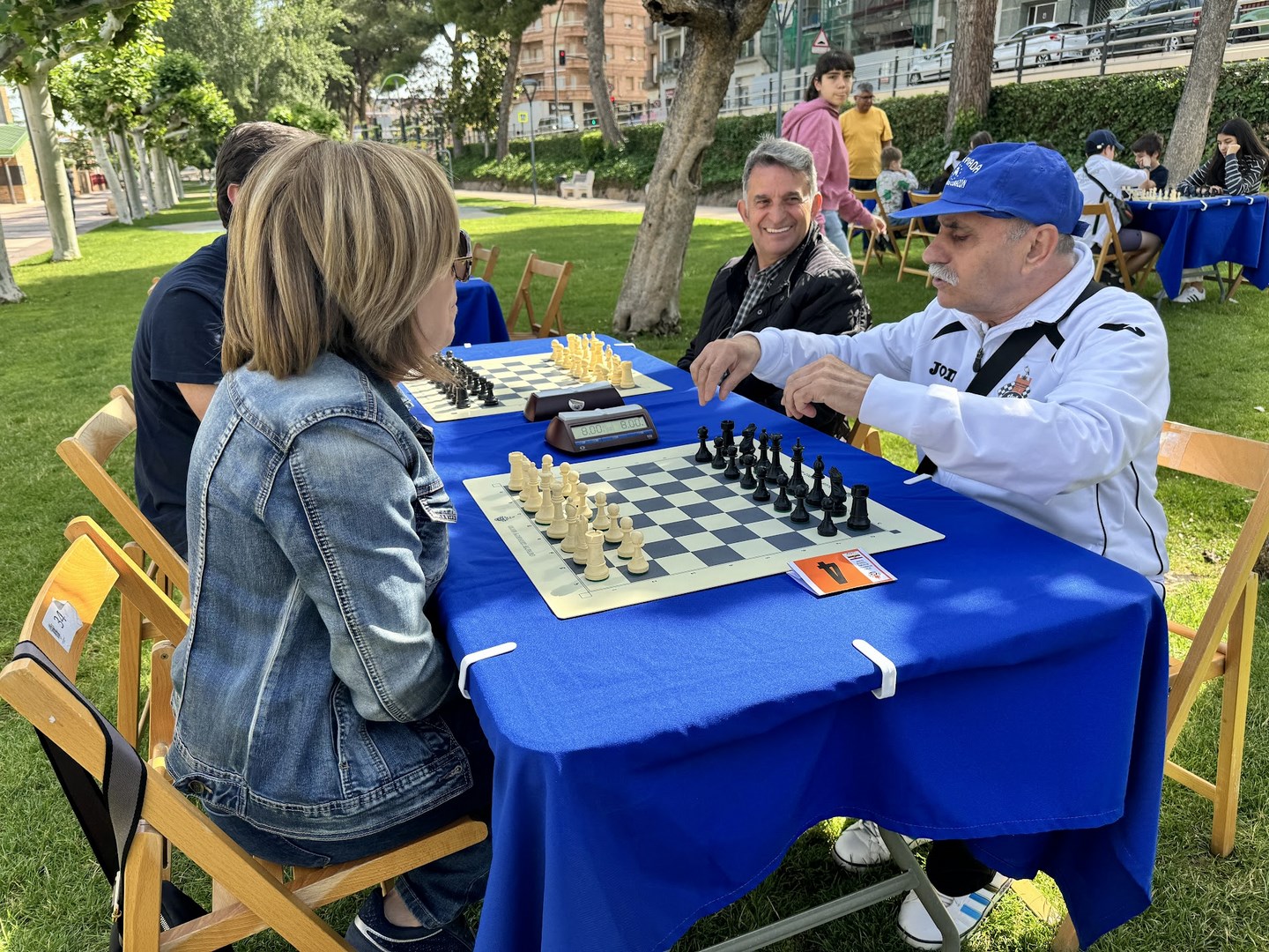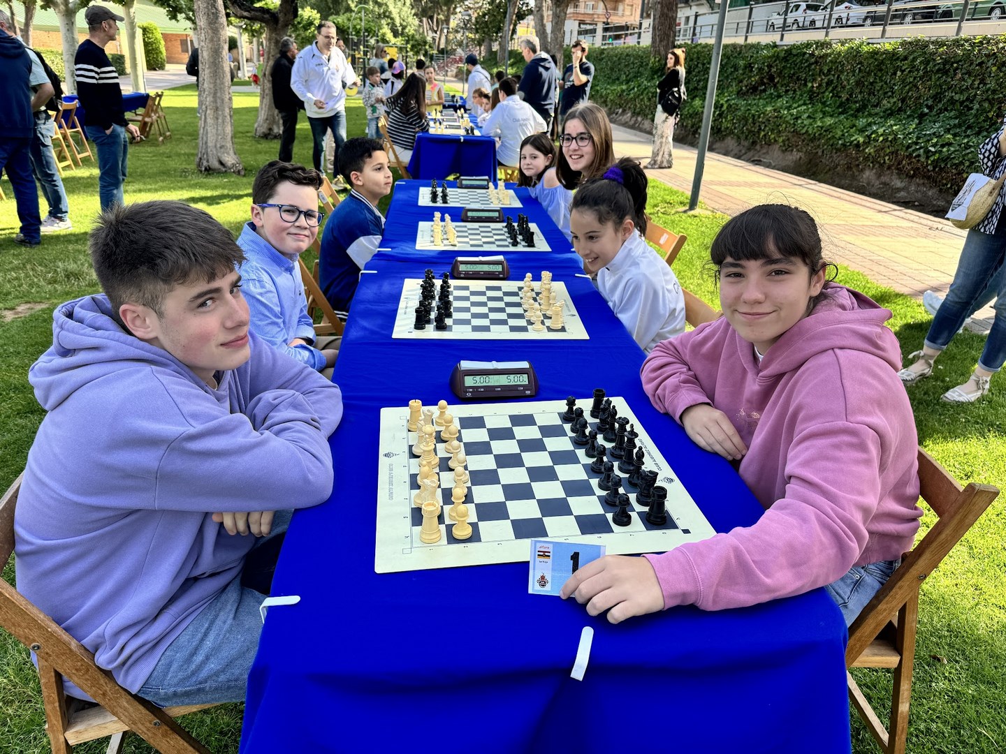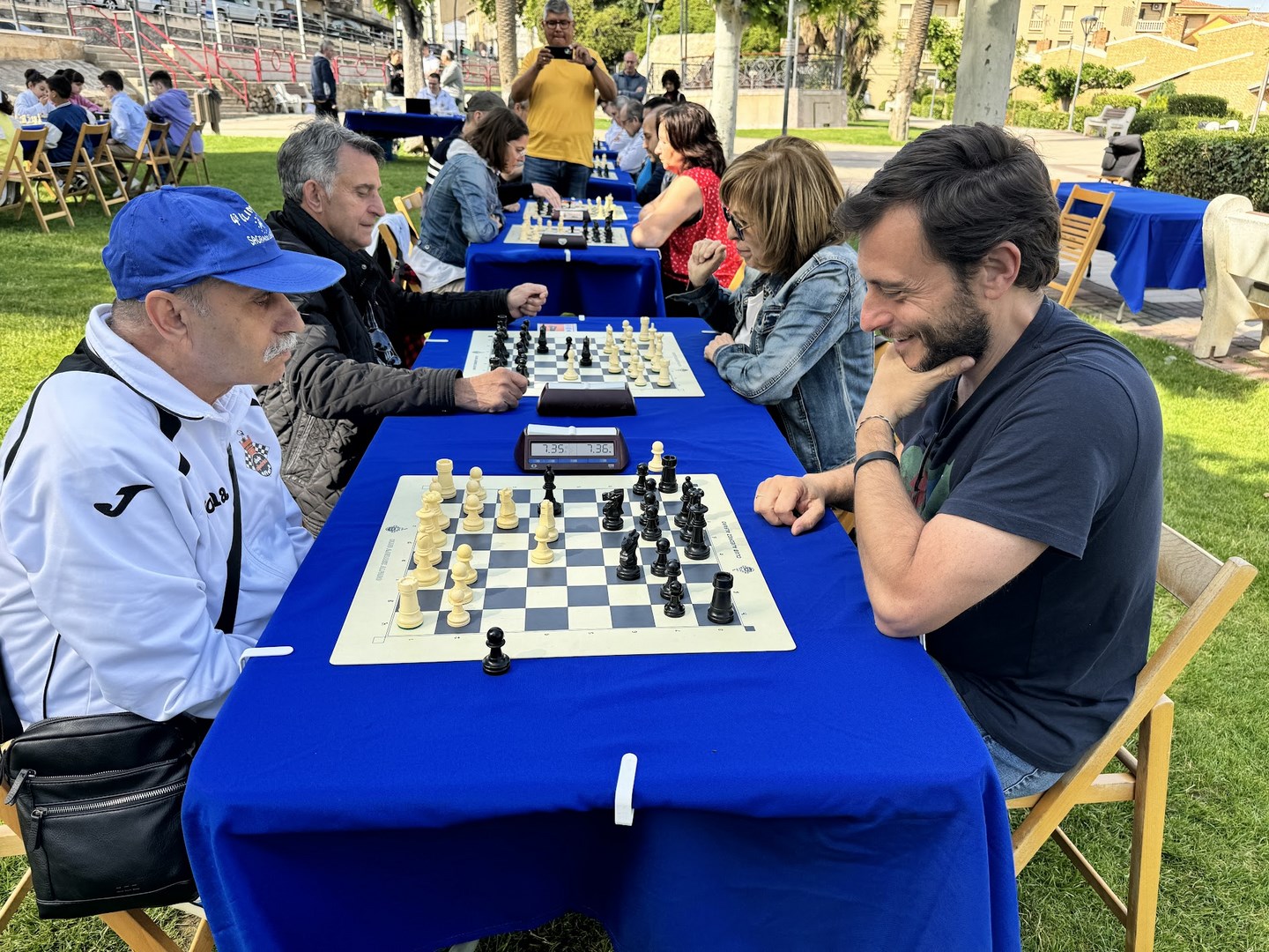 El de los mayores enfrentó por un lado a jugadores de Alfaro, Logroño y Aldeanueva, en el equipo al que denominamos como los Titanes del Ebro. Y por otro lado a jugadores de Arnedo y Calahorra, en el equipo al que bautizamos como los Titanes del Cidacos. Repitieron varios enfrentamientos con blancas y con negras entre sí. El duelo de titanes resultó de lo más ameno, y al final se resolvió a favor de los del Ebro, incluso después de un último reto a todo o nada aceptado por ambos contendientes.