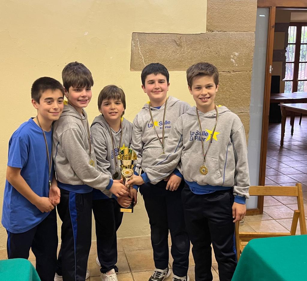 El colegio La Salle-El Pilar de Alfaro se ha proclamado campeón escolar de ajedrez por colegios, con un equipo formado por 5 alumnos de la escuela de club Ajedrez Alfaro: Daniel Jiménez, Paúl Martínez, Iñigo Lajusticia, Marcos Malo y Pablo Revilla, bajo las directrices de nuestro monitor Santiago García (desde la distancia, ya que no nos pudo acompañar finalmente). Una extraordinaria actuación de este equipo, al que no le pesó el favoritismo de ser el único equipo con dos jugadores con ELO, mejorando su juego ronda a ronda. Nos alegró y sorprendió positivamente la templanza de Marcos en este torneo después de una época de ausencia de los torneos.