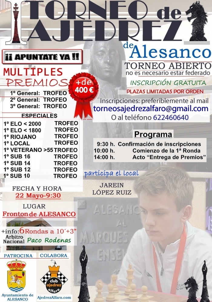 Nuestros amigos de Alesanco han preparado el I Torneo de Ajedrez de Alesanco, para el que el Club Ajedrez Alfaro colabora en su organización. Os animamos a que participéis.
