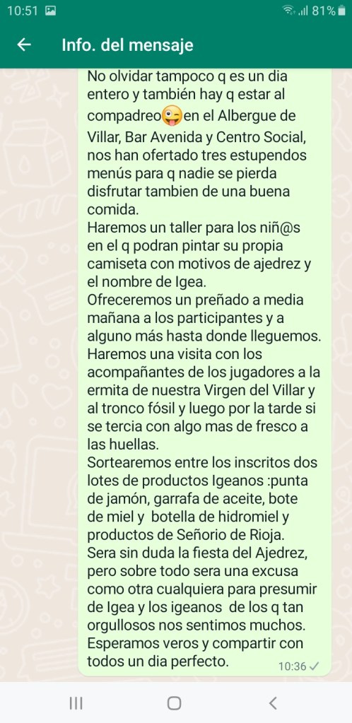 ¡Cómo nos identificamos con nuestros amigos de Igea! Y qué cerca nos sentimos de ellos. Cerca de ese Toño, quien nunca pone una mala cara a su enfermedad, y es el más ferviente seguidor de este juego. Cómo llena las clases con su entusiasmo. Cerca de ese Miguel, incansable promotor del torneo, y que busca y encuentra soluciones para todo. Cómo nos gustaría verlo también en el aula. Cerca de ese Sergio, alcalde de la localidad, y al que vimos absolutamente convencido del ajedrez en Igea. Cómo nos gustaría volver a ver un grupo de niños como el que había antes de la pandemia. Cerca de ese Angel, quien no pudo estar en este día, pero que hace lo imposible para que su hija tenga la formación que desea. Cómo nos gustaría verla progresar durante muchos años. Y cerca de esa Susana, el alma del torneo, el alma del ajedrez en Igea. Cómo nos gustaría tenerla durante mucho tiempo con nosotros.