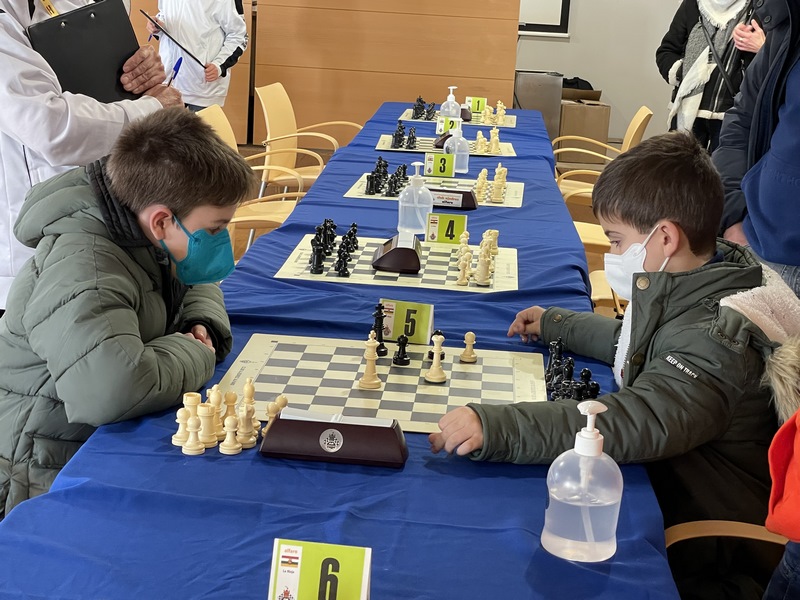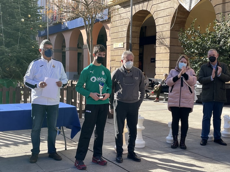 Mientras tanto en el interior de la Sala de Exposiciones del Antiguo Ayuntamiento se disputaban interesantes partidas. Con alguna aparición sorprendente, como la del joven Raúl Burriel de Oberena, un sub 10 que se mantuvo constantemente en las primeras mesas. Otras actuaciones no sorprendieron, como la del campeón de la categoría B, Daniel Mariné, un niño que ya tiene que pensar en objetivos superiores. El final de la categoría A, muy disputada, resultó emocionante. Angel Esparza, de Mikel Gurea, llegaba con ventaja al frente de la clasificación, y sentaba ante sí a Diego Soto en la mesa uno. Ya hemos hablado en alguna ocasión de este jugador de la SAL de Logroño, que por afición y por su evolución va a ser un rival interesantísimo con el que competir de aquí en adelante. Con negras le ganó la partida a Angel, lo que le daba la oportunidad al ganador de la mesa dos a hacerse con la victoria. Ganaron también las negras de nuestro jugador Juan Burgui, frente al tudelano Rodrigo Sanz. Y con este punto Juan ganó el torneo. Diego acabó subcampeón. Aitor Esparza, hermano de Angel, se llevó el trofeo al tercer clasificado, y el propio Angel, siendo el mejor sub 12, hizo que fueran dos los trofeos con los que volvieron a casa. El tercer jugador que vino de Mikel Gurea, Jon Merino, también consiguió trofeo, el de mejor sub 10. Sarai Falcón se sumó a los premiados, con su trofeo a mejor femenina.