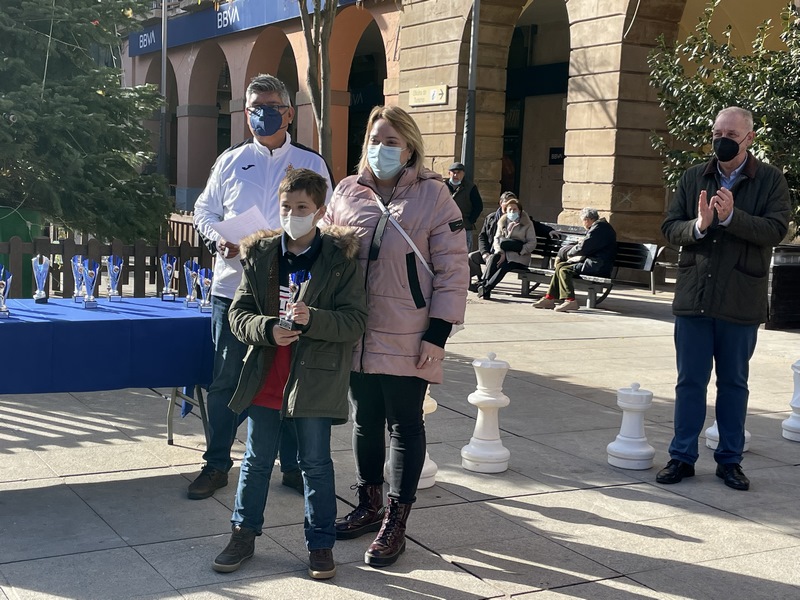 De la necesidad surgió una idea que se reveló brillante, y de la que tomamos nota para posteriores ediciones. No fue otra que la de sacar a la plaza la entrega de premios. Una mesa con los trofeos instalada bajo el árbol de Navidad, y flanqueada por las figuras del ajedrez gigante, despertaba la curiosidad de propios y extraños. El tiempo quiso ser otra vez nuestro aliado, y nos brindó una espléndida mañana soleada, que invitaba a pasear y acercó a bastante gente a la plaza, que entre unas cosas y otras acabó llenándose con un animado bullicio. Algún padre no conseguía separar a los más pequeños de las piezas gigantes.