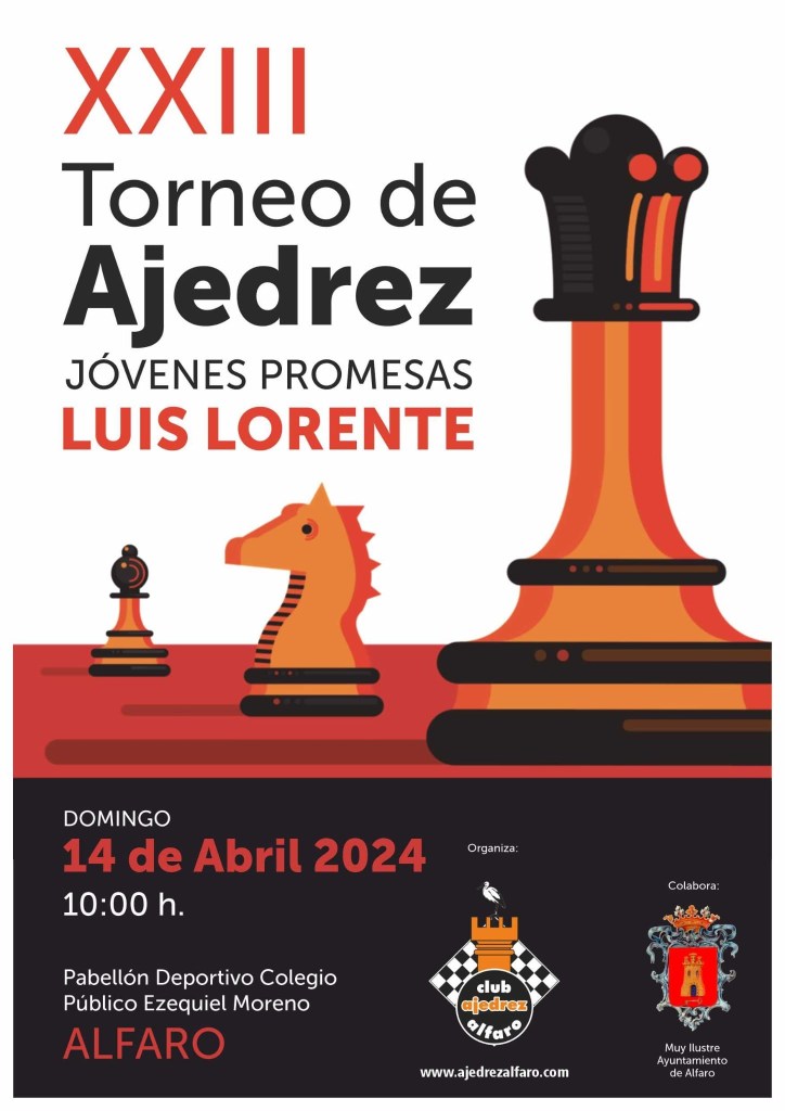 1º El XXIII Torneo Ajedrez Promesas Alfaro se celebrará el domingo 14 de abril de 2024 a partir de las 10:00 h. en Polideportivo Colegio Obispo Ezequiel Moreno, Paseo Florida, 27, Alfaro. Entrega de premios a las 14:00h.