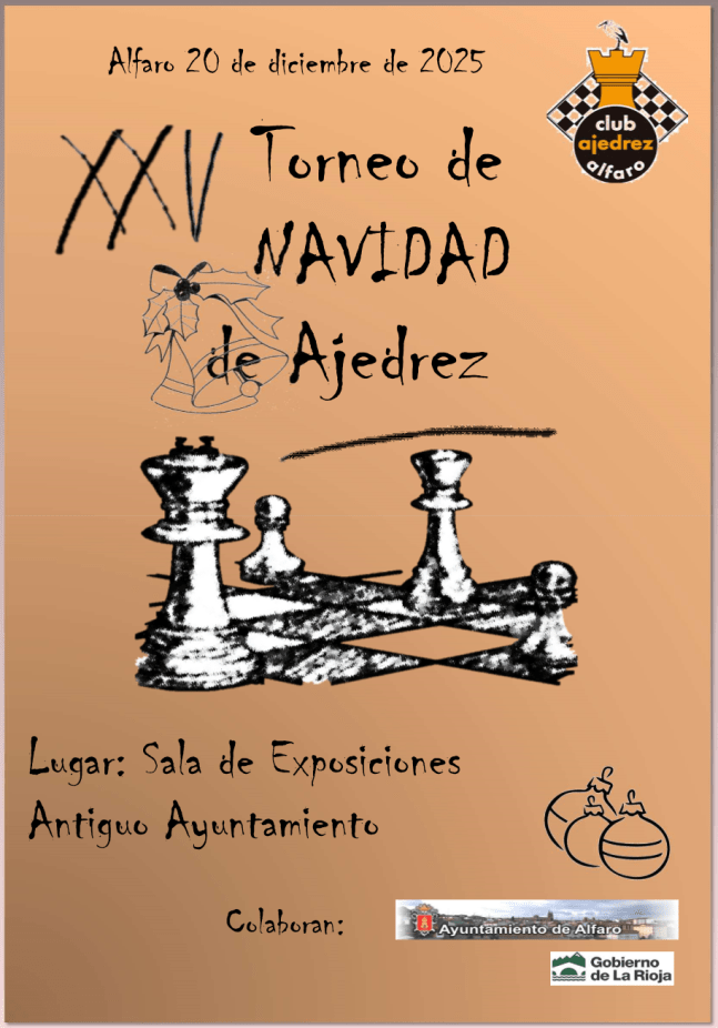 Un año más el Club Ajedrez Alfaro celebra el tradicional Torneo de Navidad. El próximo sábado 20 de diciembre será la cita, en la sala de exposiciones del antiguo Ayuntamiento de Alfaro.