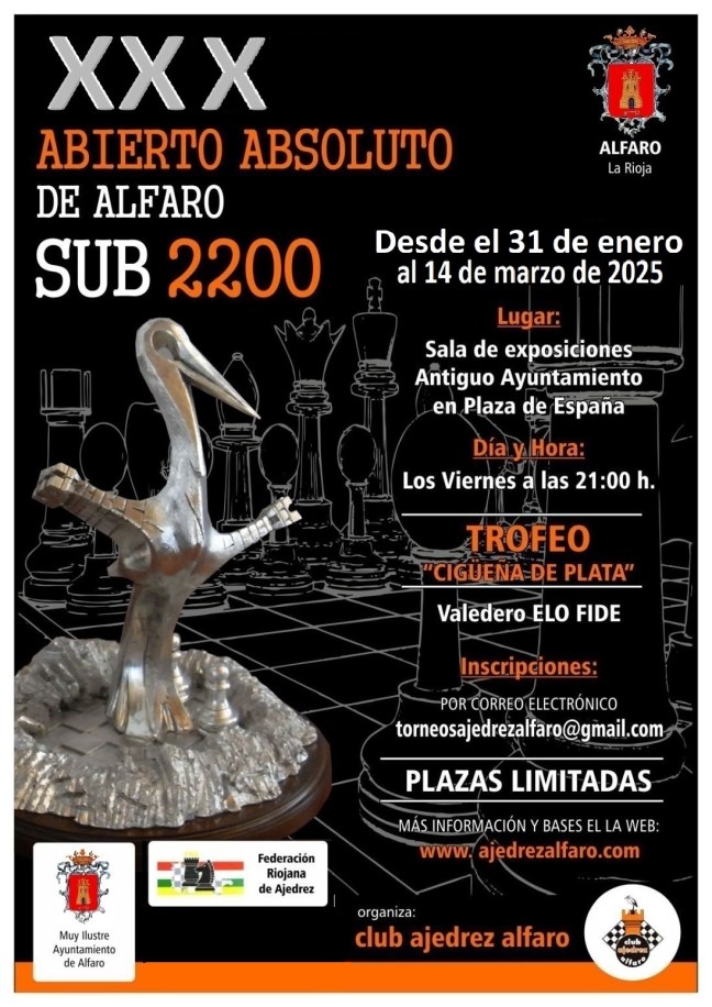 El Club Ajedrez Alfaro tiene el honor de invitaros a la 30ª edición de nuestro clásico torneo de partidas lentas, que se celebrará todos los viernes a las 21:00 horas. ¡30 años de historia acumulada, de grandes partidas, de camaradería y de pasión por el ajedrez! Un clásico que reúne a jugadores de todos los niveles para compartir la emoción del tablero en un ambiente único.
